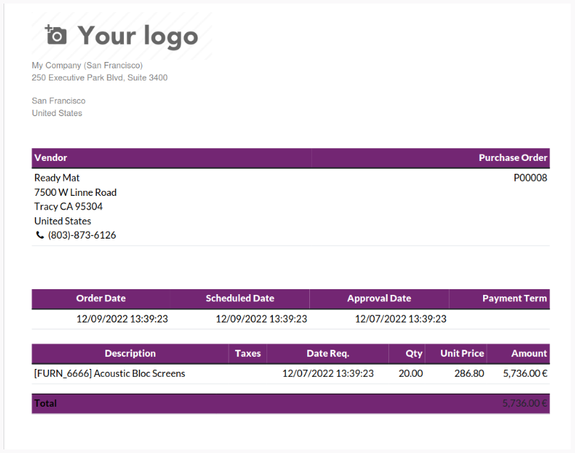| Odoo Apps Dependencies | • Inventory (stock) • Invoicing (account) • Purchase (purchase) • Sales (sale_management) • Discuss (mail) |